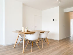 Je komt binnen via de inkomhal met ingebouwde vestiaire. Dit appartement met hedendaagse afwerking beschikt over een open, ingerichte keuken met een koelkast, diepvries, inductie kookplaat, dampkap, vaatwas en oven. Dankzij grote raampartijen geniet je van veel lichtinval in de woon-en eetruimte.