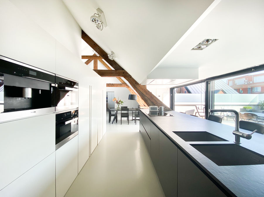 Verder door valt de grote, lichte leefruimte met houten spanten op. Zowel het zuidoost georiënteerd terras als het salon lenen zich perfect voor een cosy avond met een glas rode wijn. Deze ruimte loopt over in de prachtige open keuken welke volledig uitgerust is met 2 ovens, inbouw koffiemachine, vaatwasmachine, inductie kookplaat en inloop-voorraadberging. Dé plek voor een lekker ontbijt samen met de kinderen. De keuken loopt vloeiend over in de leefruimte dankzij de maatkasten in L-vorm en de prachtige PU gietvloer.
