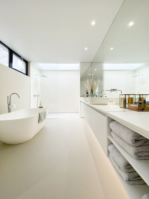 Op de tussenverdieping bevindt zich een aparte berging voor een wasmachine en droogkast. Ook de badkamer heeft een PU vloer en PU wanden en huishoudt een op maat gemaakte wastafel, vrijstaand bad, ruime inloopdouche en toilet. Er is veel lichtinval maar tegelijk ook volledige privacy, wat wil je nog meer?